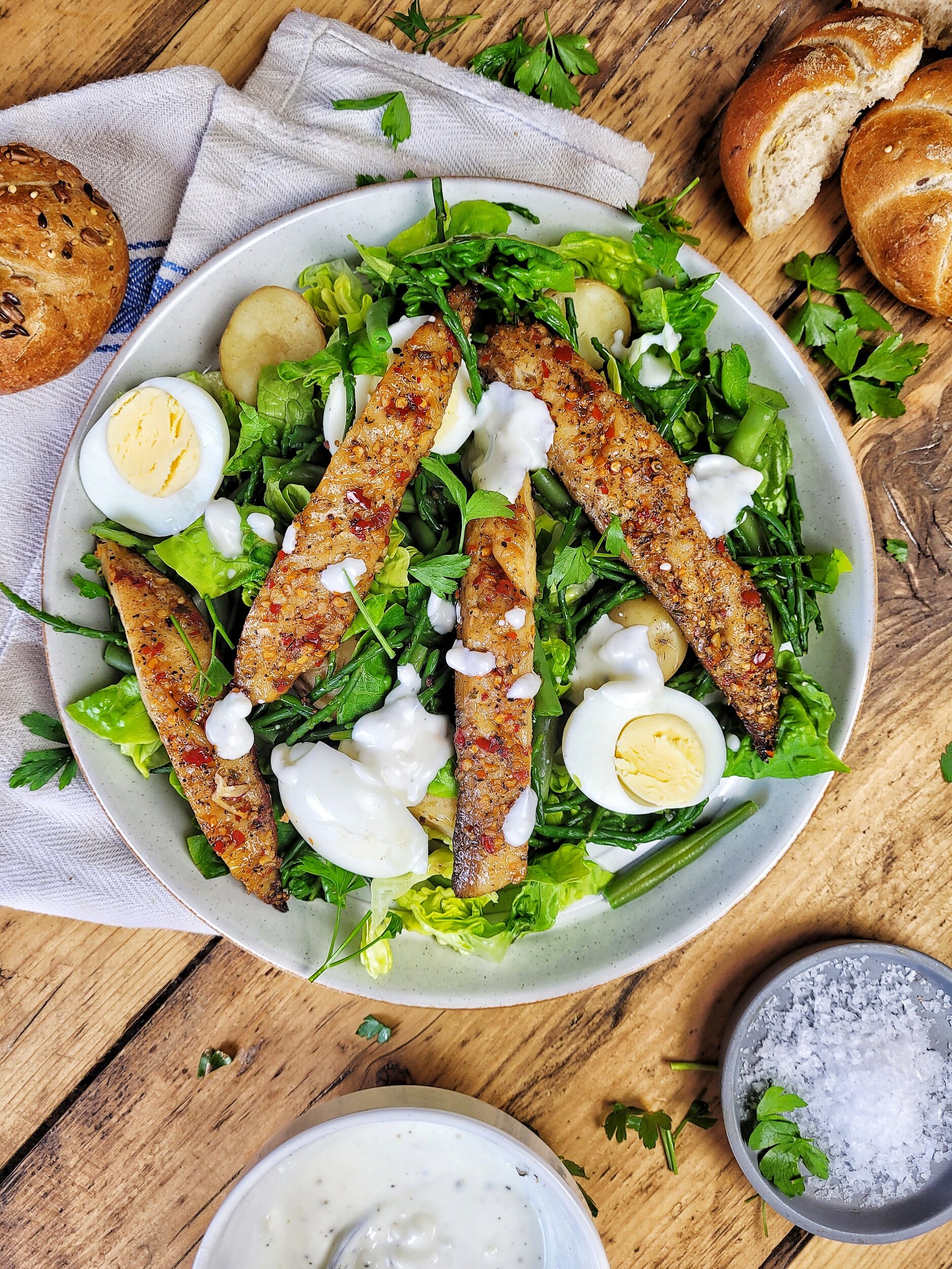 Our take on the classic tuna nicoise, yet more delicious. A healthy salad topped with green beans and salty samphire work perfectly with the smoked mackerel. All accompanied by freshly boiled eggs, baby new potatoes and a delicious yoghurt dressing to tie everything together.